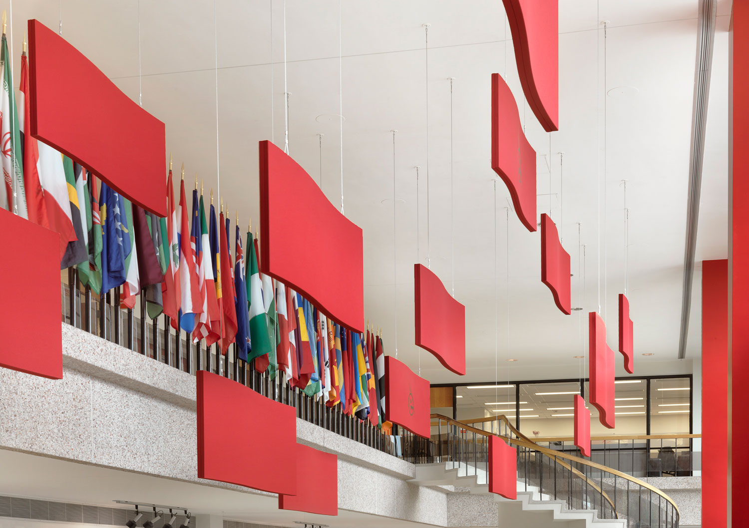 Acousti-Image Baffles are vibrant looking high quality images on sound absorbing baffles. These custom printed baffles absorbing sound in open ceiling systems. Hang our Baffles from existing ceiling grid systems or from roof decks and bar joists in open ceilings. Custom Printed Baffles are used for advertising, branding and decoration. Available in custom shapes and sizes.
