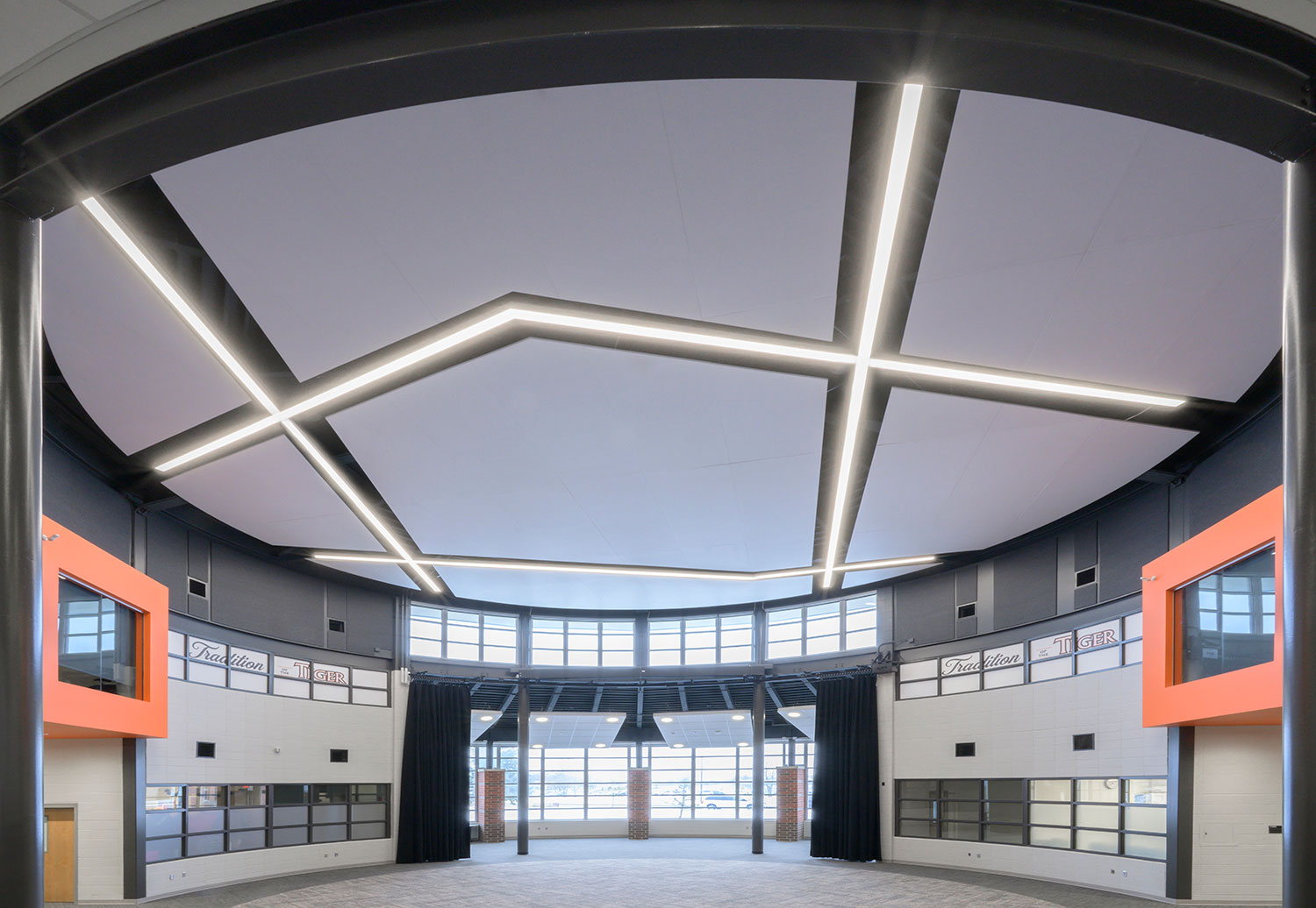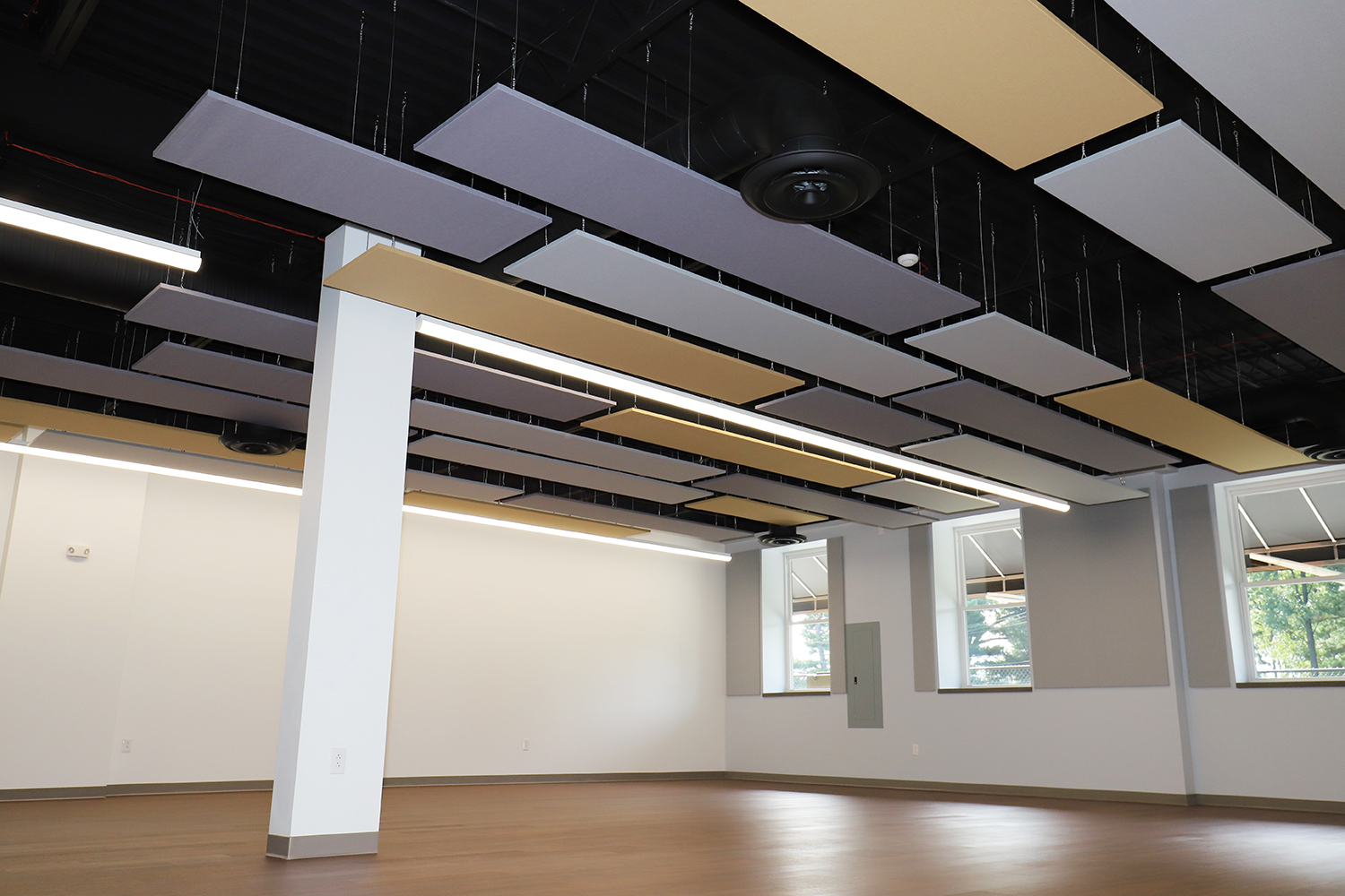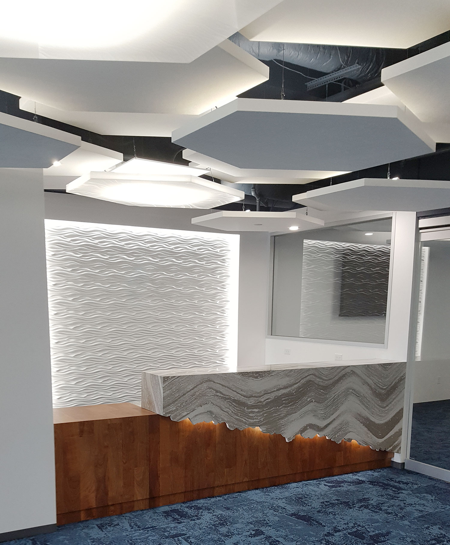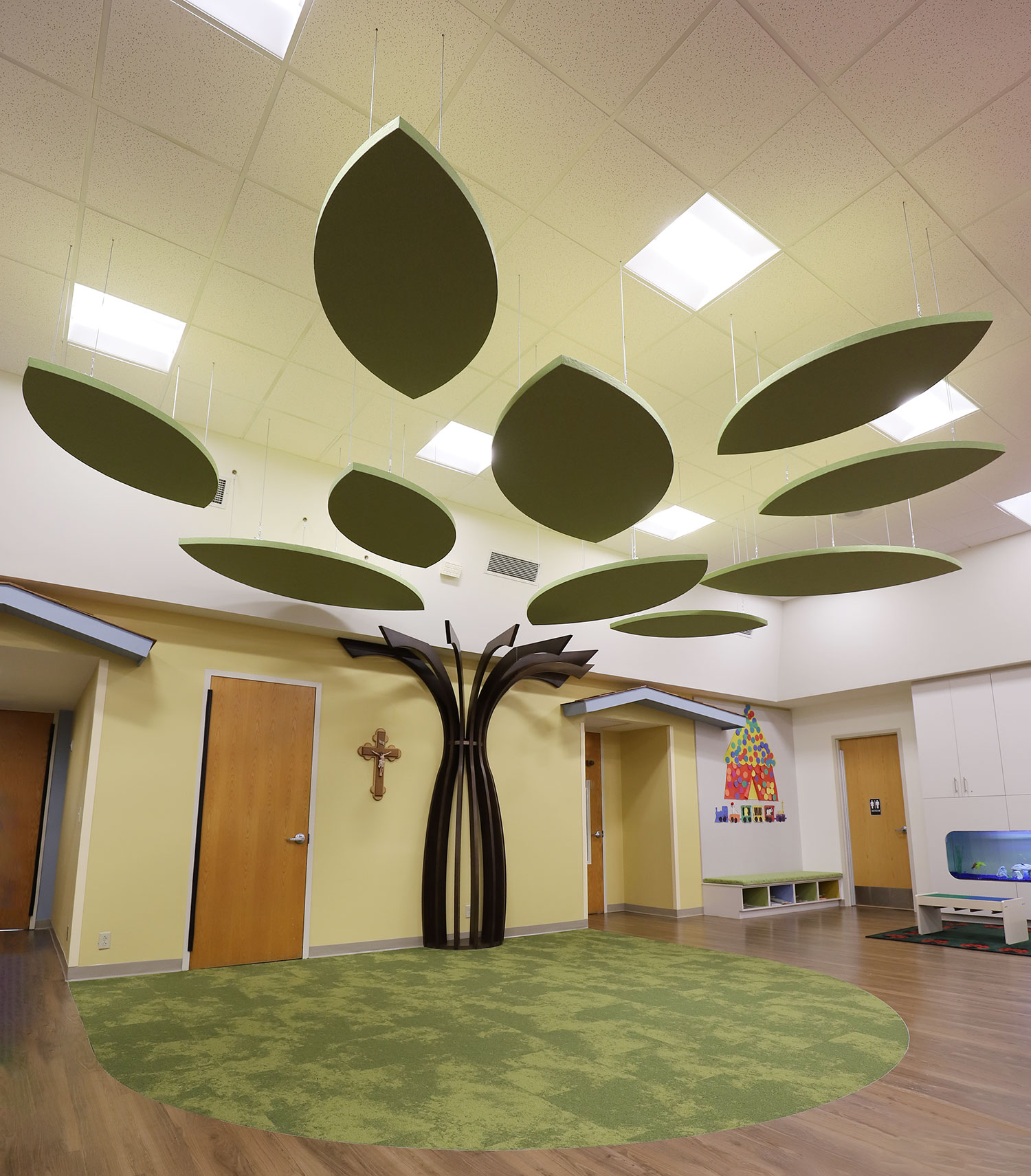 Serenade Clouds (SC) are flat, custom shaped sound-absorbing panels independently hung from the ceiling. Serenade Clouds hang at any angle from the ceiling, depending on the desired design and acoustical effect. All mounting hardware is embedded in the fiberglass core.